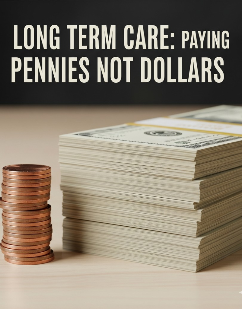 LTC insurance works the same way. You pay a small premium now so you don’t face impossible costs later.